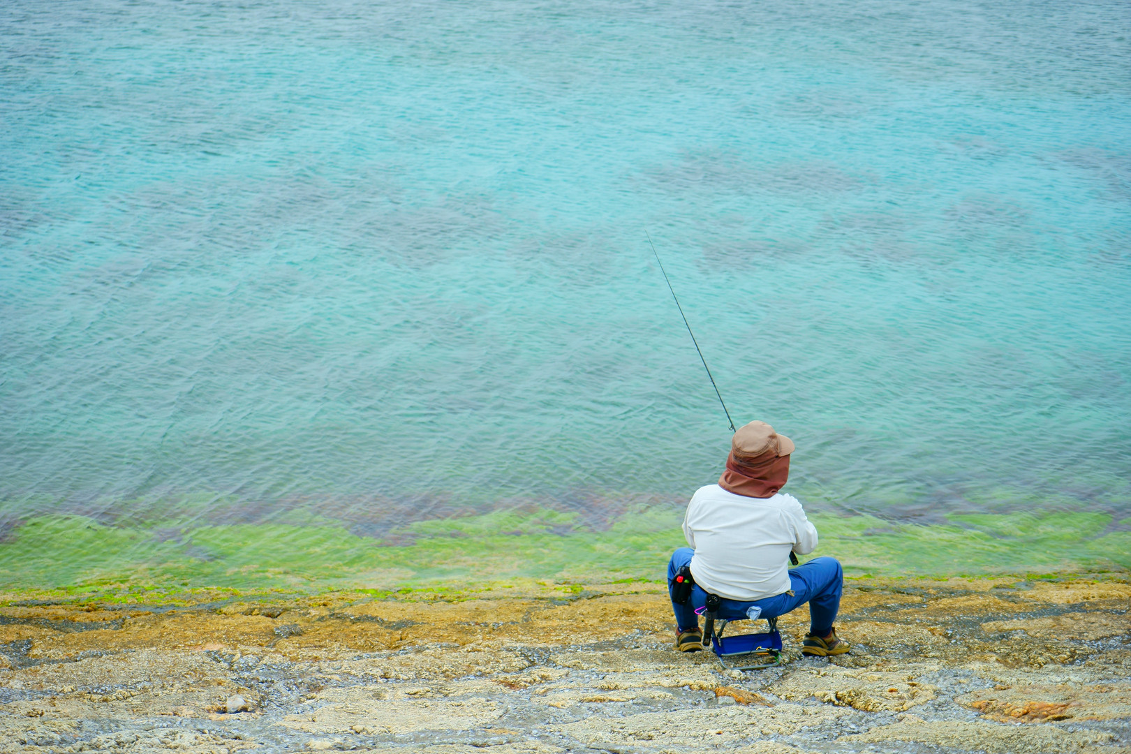 沖縄でのんびり釣りをするおじさんをパシャり!! 沖縄!エメラルドグリーン!!最高です^^