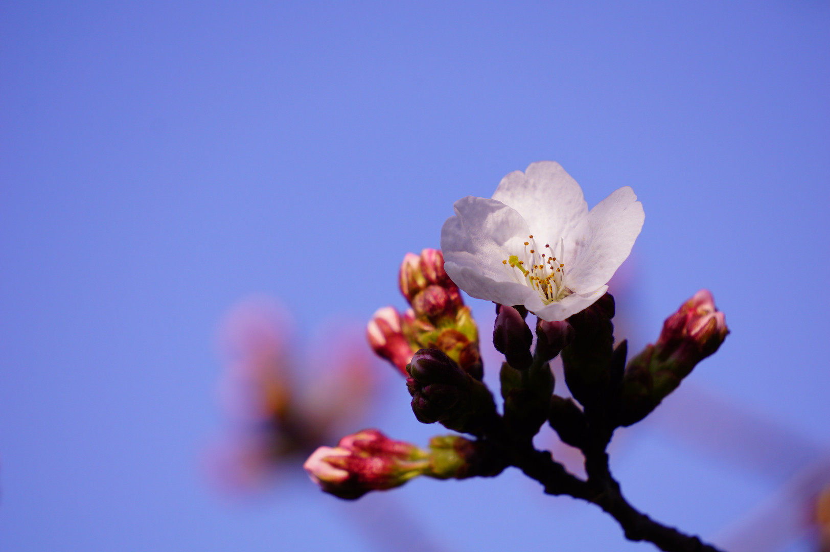近所にお散歩に行った時の一枚です。 まだ全然咲いていなくて、1本の木に一輪だけ咲いていました♪