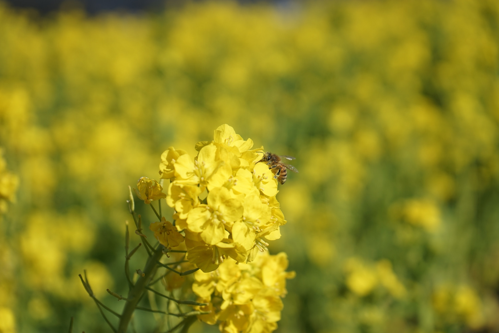 菜の花畑で、体中が花粉まみれになりながらも蜜を集める蜂に、敬服の思いです。