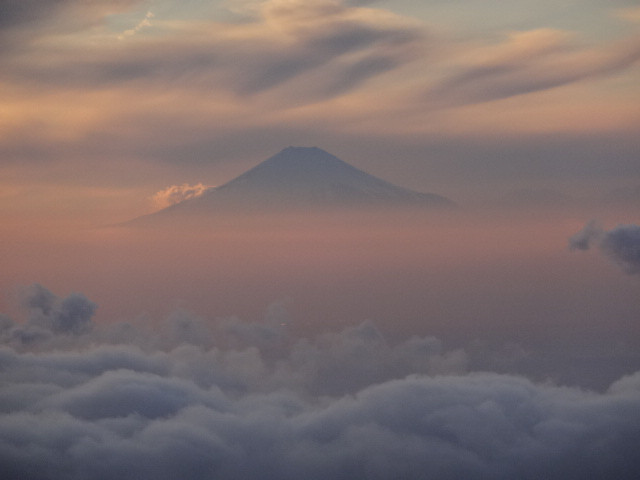 夕焼けに染まる遠くの雲の上に、富士山が頭を出していました。