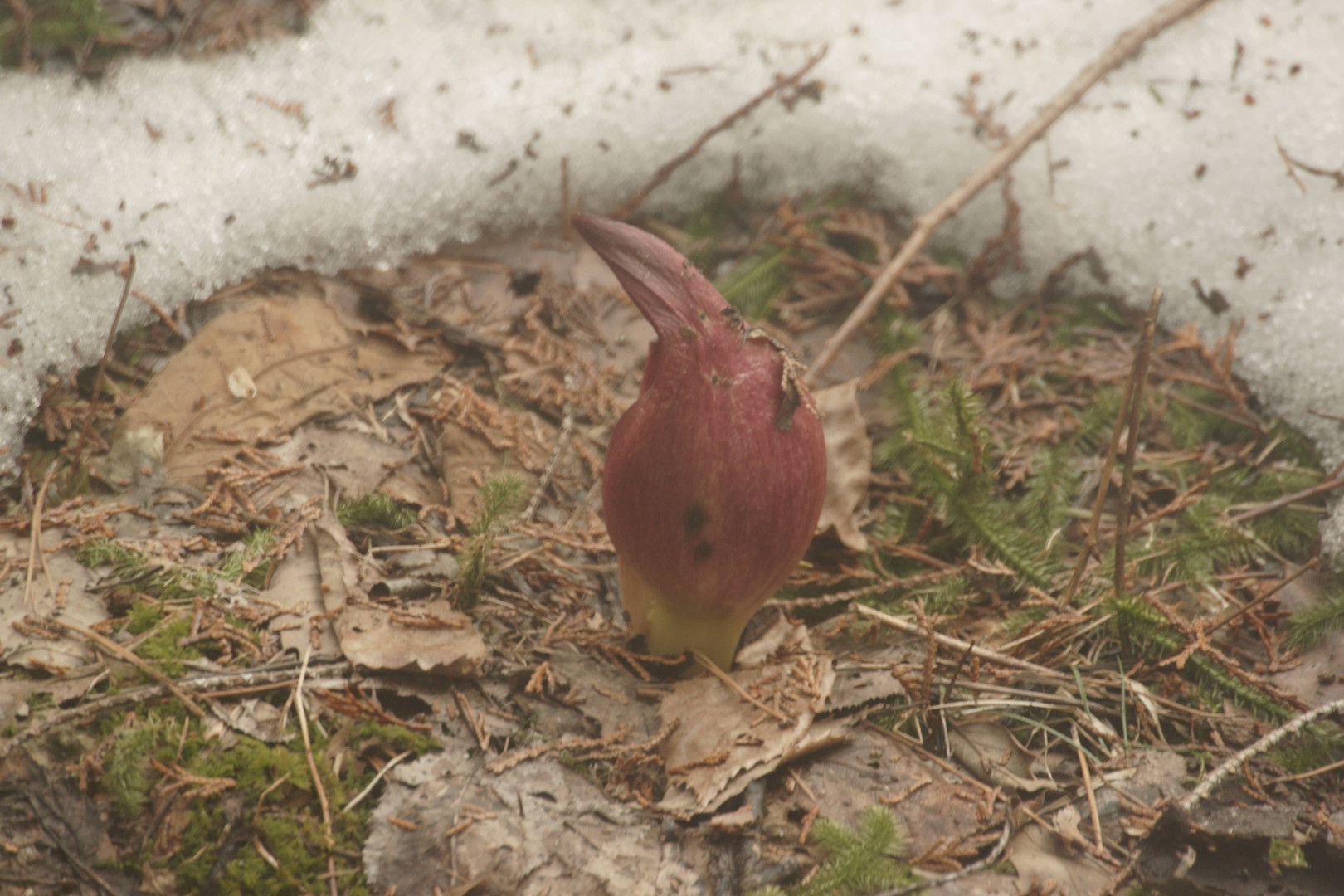 春になり座禅草が咲きました周りの雪を溶かし