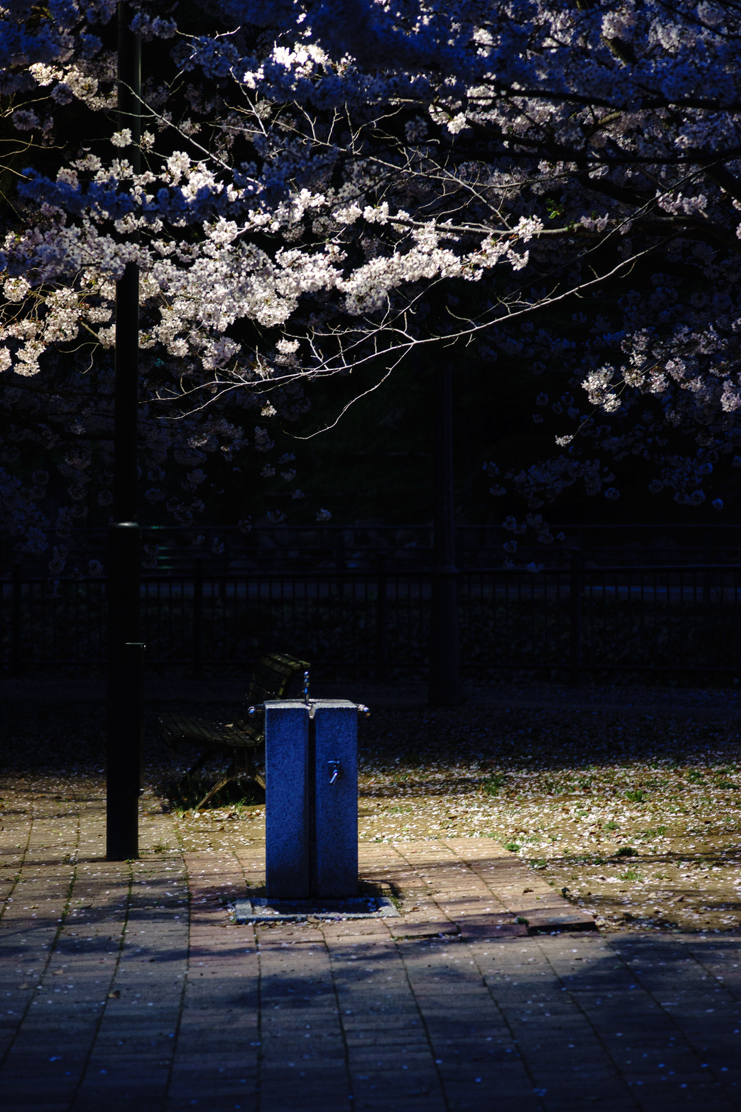 街灯のすぐ下まで伸びた満開の桜です。 街灯のごく近くの部分だけ明るくなっていて薄暗い夜の公園との対比が綺麗でした。 ちなみに撮影場所は原爆爆心地からほんの10メートルぐらいの位置。 花見は禁止されていますが、今や桜が美しい公園となっています。