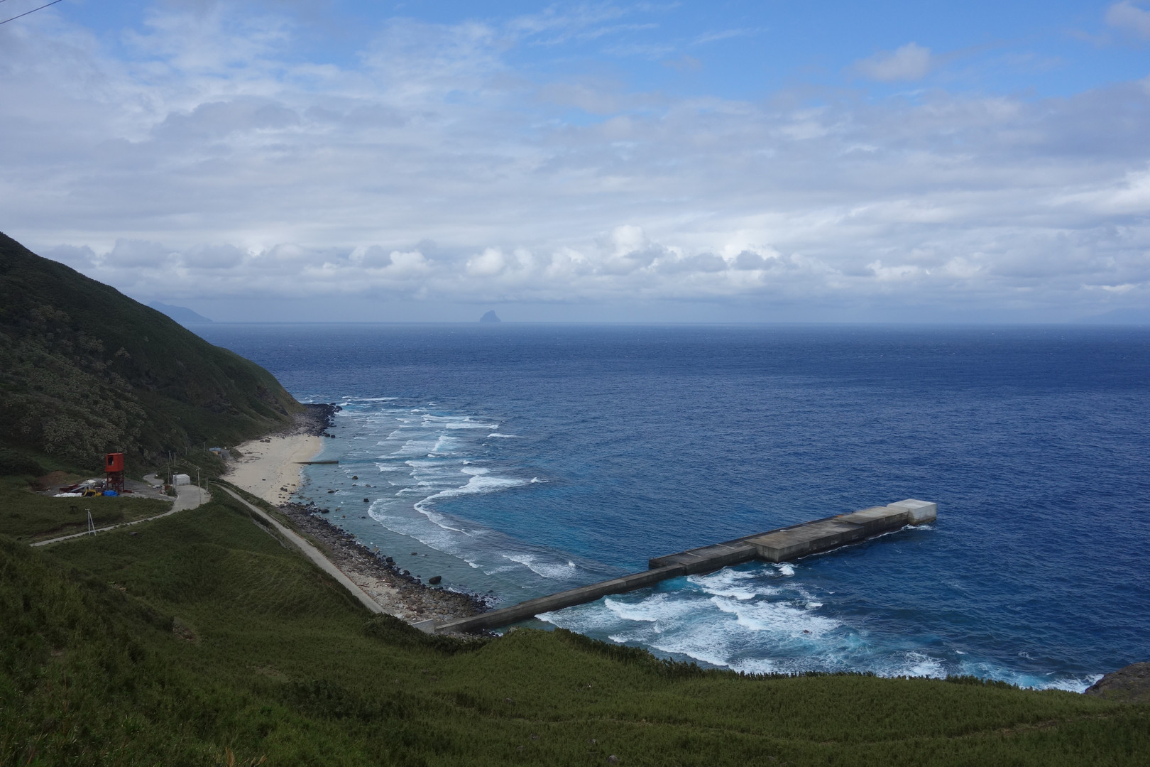 中腹から先ほどの東之浜を撮影。 かなり海が荒れて波が白く寄せています。 港というより,ぽつんとコンクリートが出ているだけですね,ほんと。 日本の一部とは思えないかもしれません。