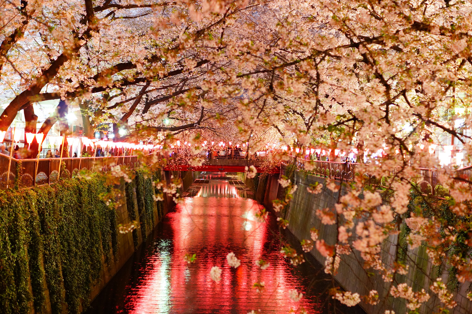 桜のトンネル越しの赤い電車