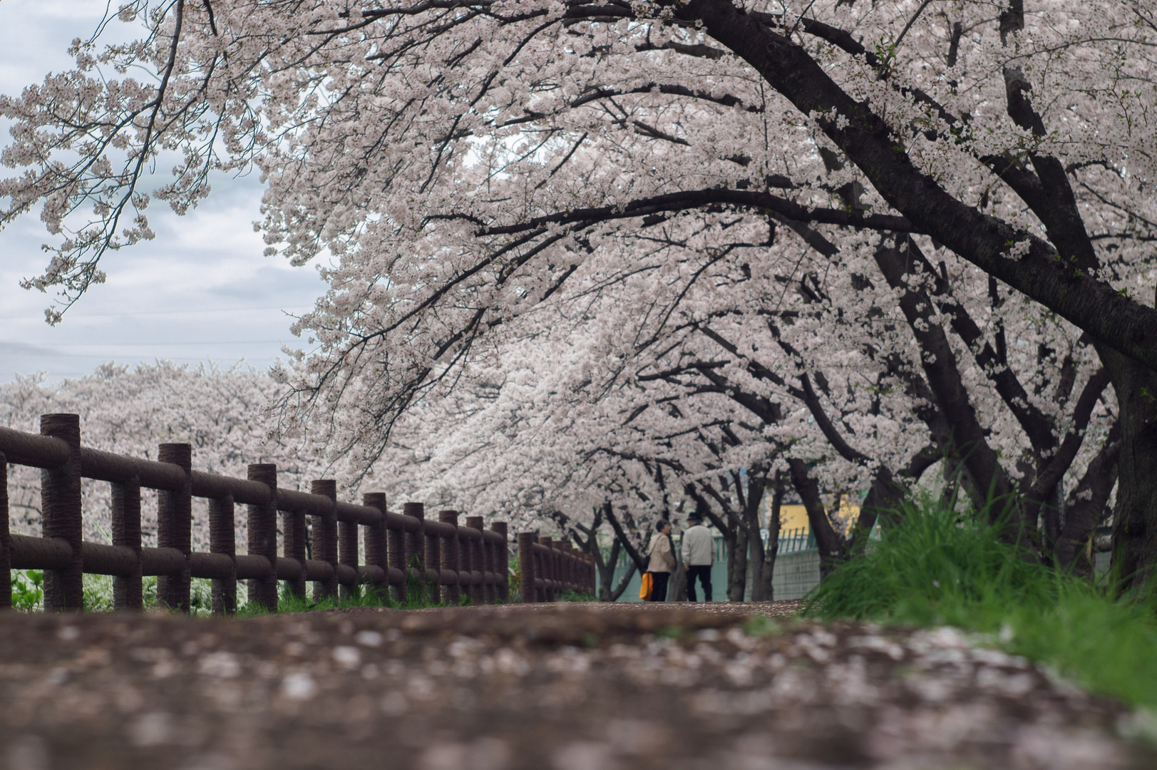 近所の桜堤にて撮影。 散った桜の花びらを前ボケにしたくて超ローアングルで撮りました。