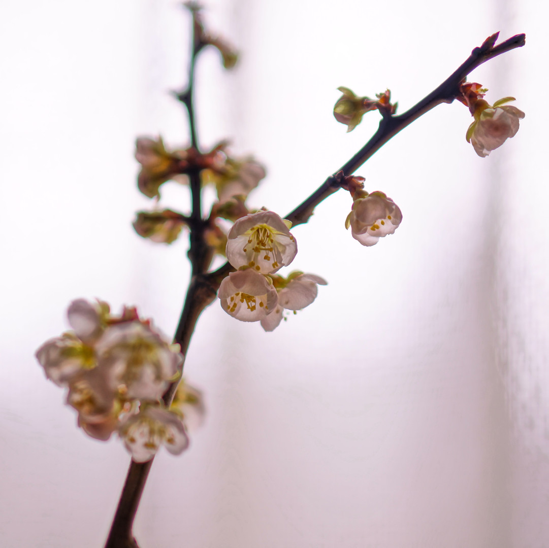 我が家に古い梅の木があります。 剪定も消毒もしていないのに毎年たくさんの梅の実がなります。 今年は手の届く範囲だけ剪定しました。 その枝を花瓶に挿して置いたら花が咲きました。 昨日「さくらを印象的に撮る」の座学に参加したので、それを参考に撮ってみました。 桜の季節までに練習しなくちゃ・・・