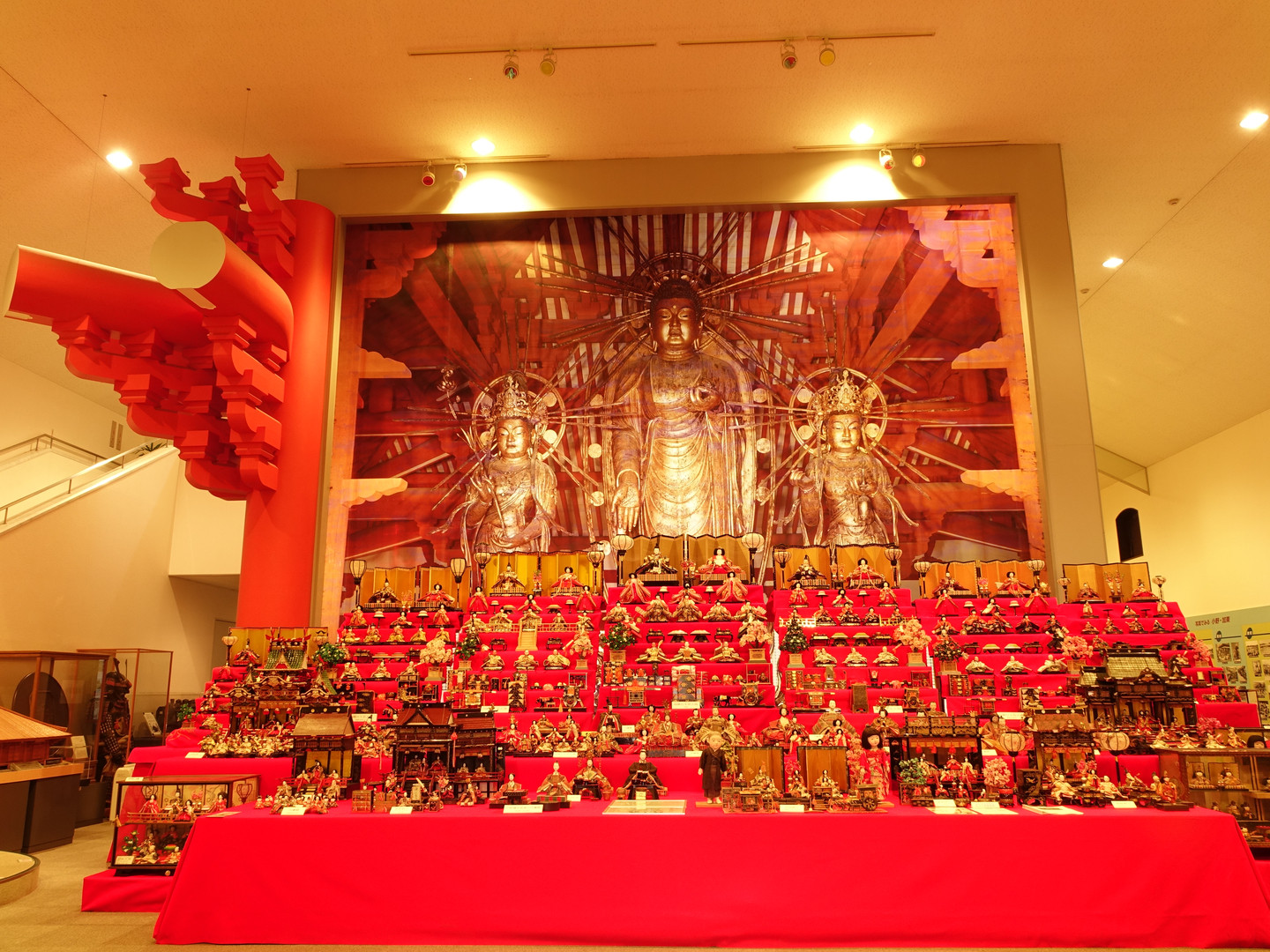 小野市にある浄土寺「阿弥陀三尊像」写真をバックにビックな雛飾りです。