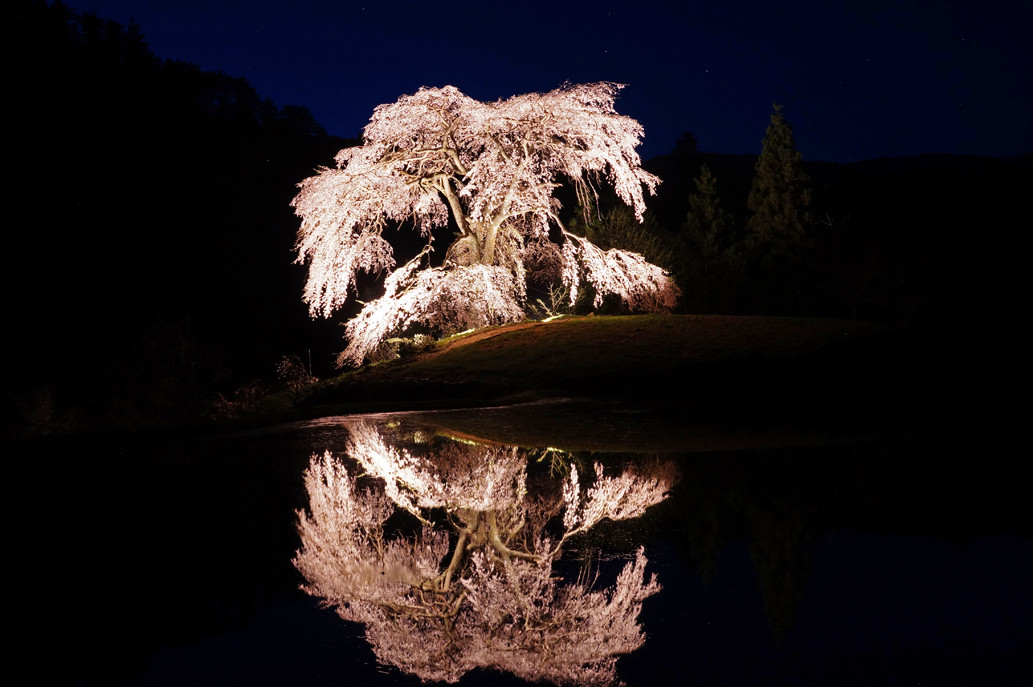 広島県・安芸太田町にある、与一野の枝垂桜の一晩限りのライトアップです。全くの無風状態で、水面に映る桜が実物にもまして綺麗でした。