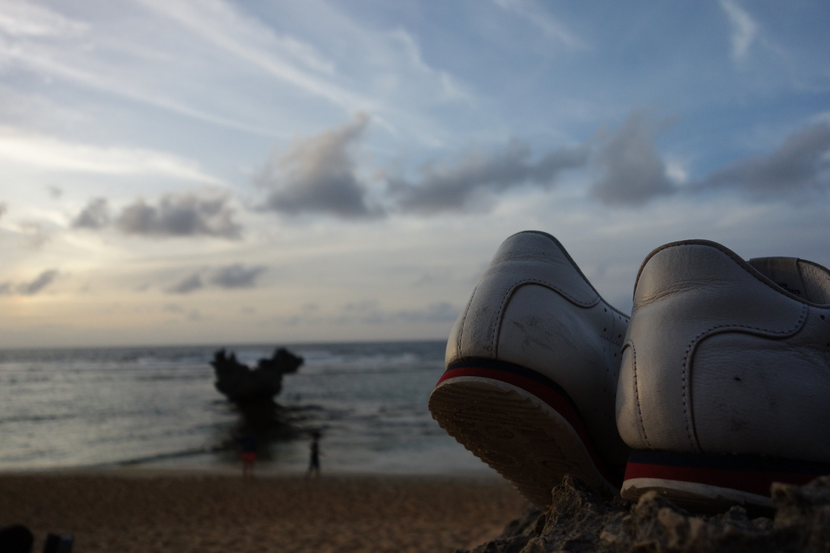 沖縄の古宇利島にあるハートロックにて。海で遊ぶために脱いでいたスニーカーにいい具合に光が当たっていたのでパチリ
