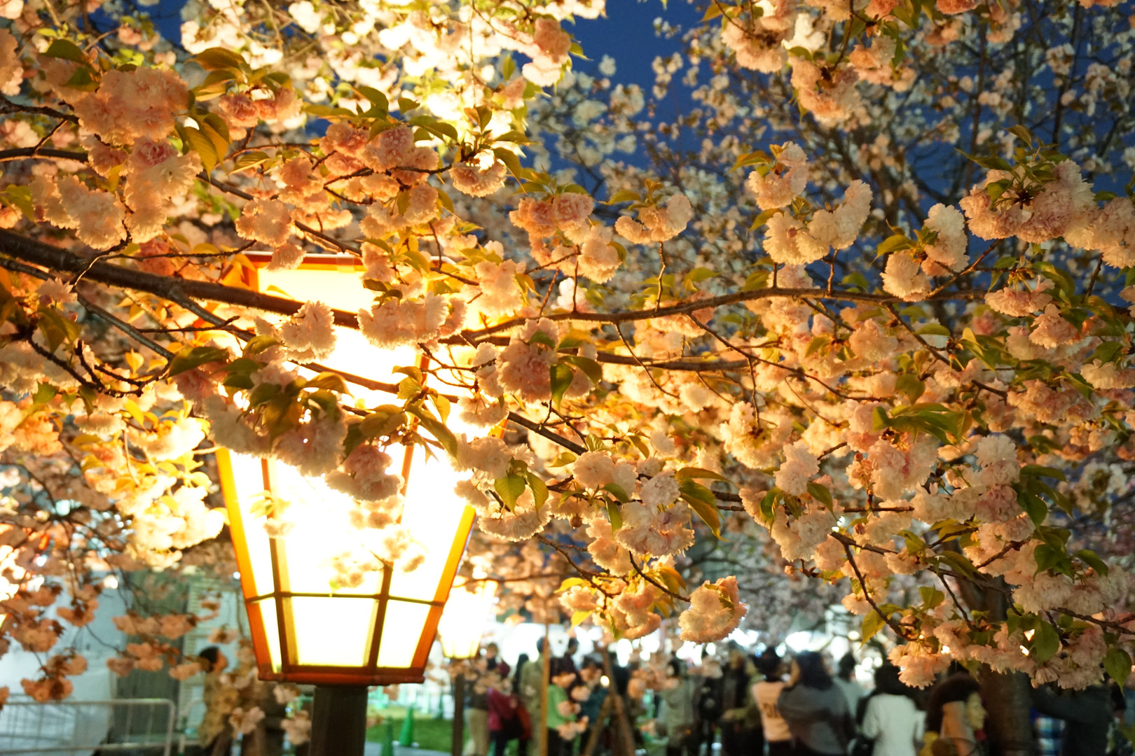 ぼんぼりに灯りが灯り始めた大阪造幣局