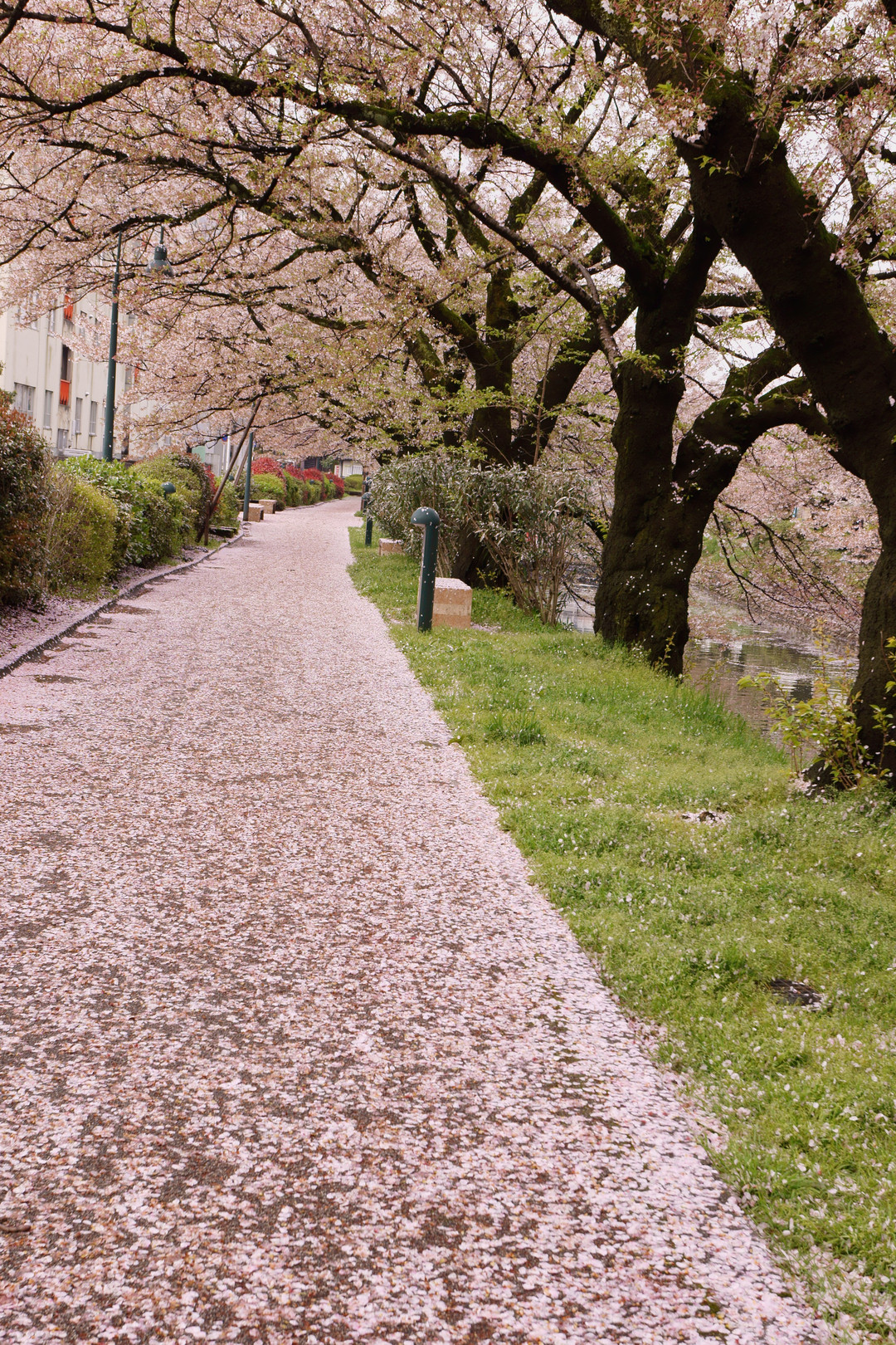 昨晩から降り続いた雨で・・・ すっかり散ってしまった桜の花が歩道いっぱいに散りばめられました。