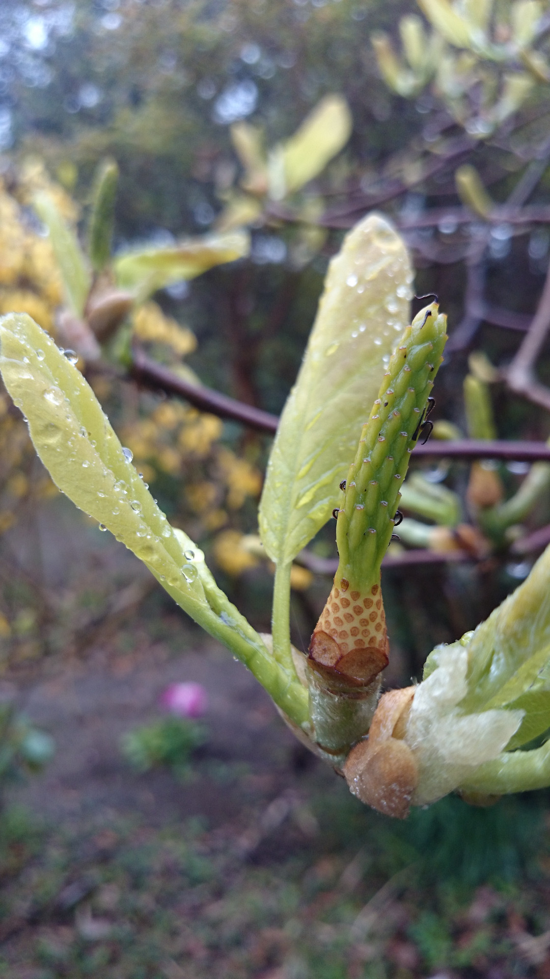 ハクモクレン花の跡。花が終わり、新芽へバトンタッチ。玉のような水滴がキラキラしてました。やはり植物は雨上がりが瑞々しくていいですね。