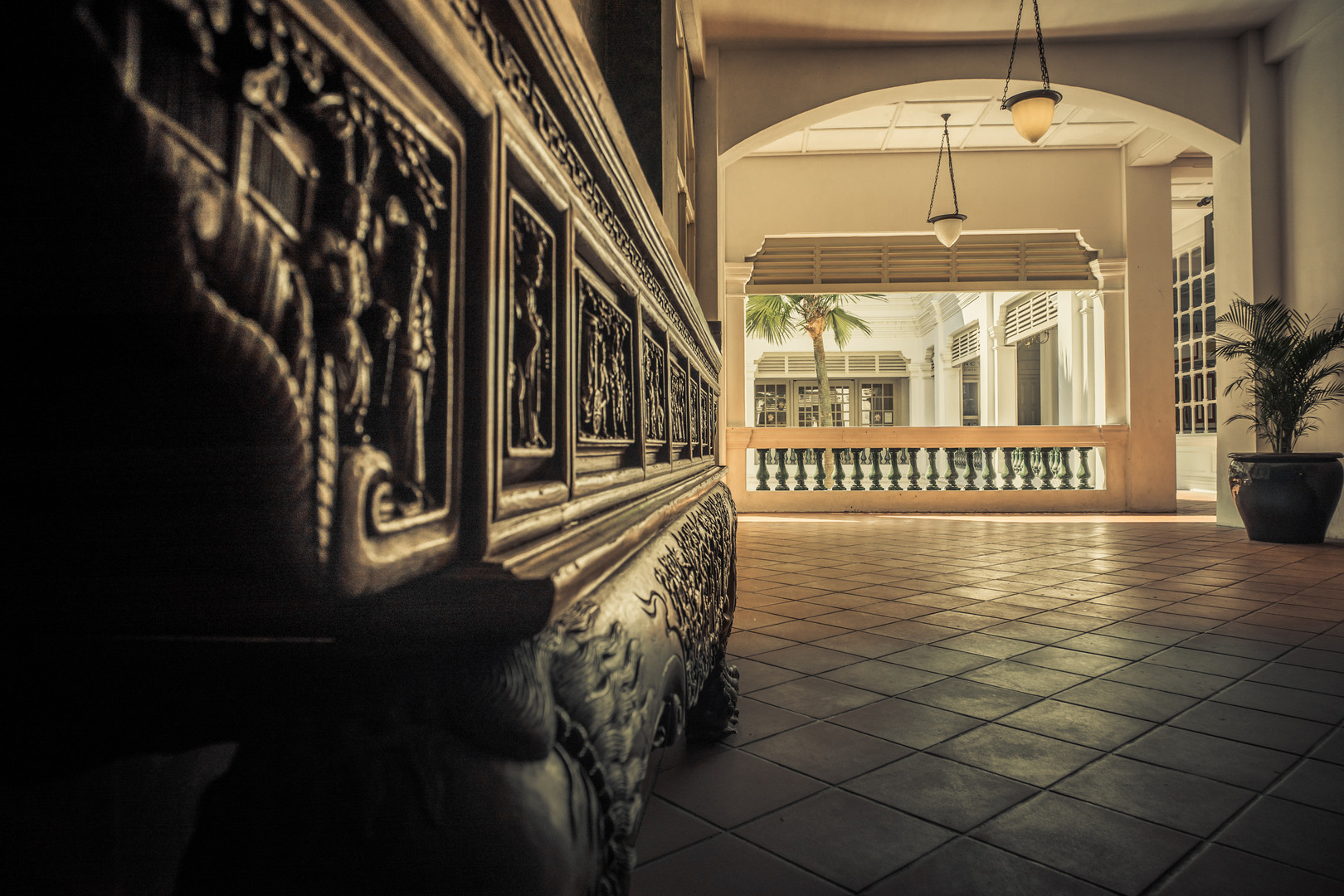 ホテルが観光地っていうのは、なんか変な感じがしますねえ。 シンガポール・ラッフルズホテルのアーケードにて。