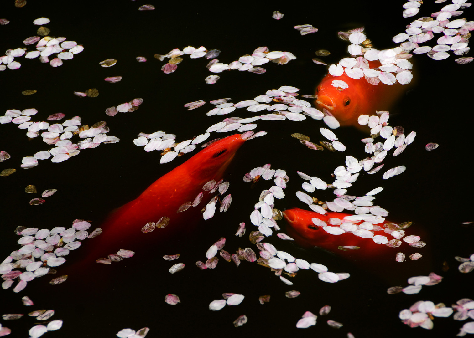 桜も散り始め、花びらと戯れる金魚、花を楽しむのは人間ばかりでなく 生き物たちも桜の季節を謳歌しているようだ。