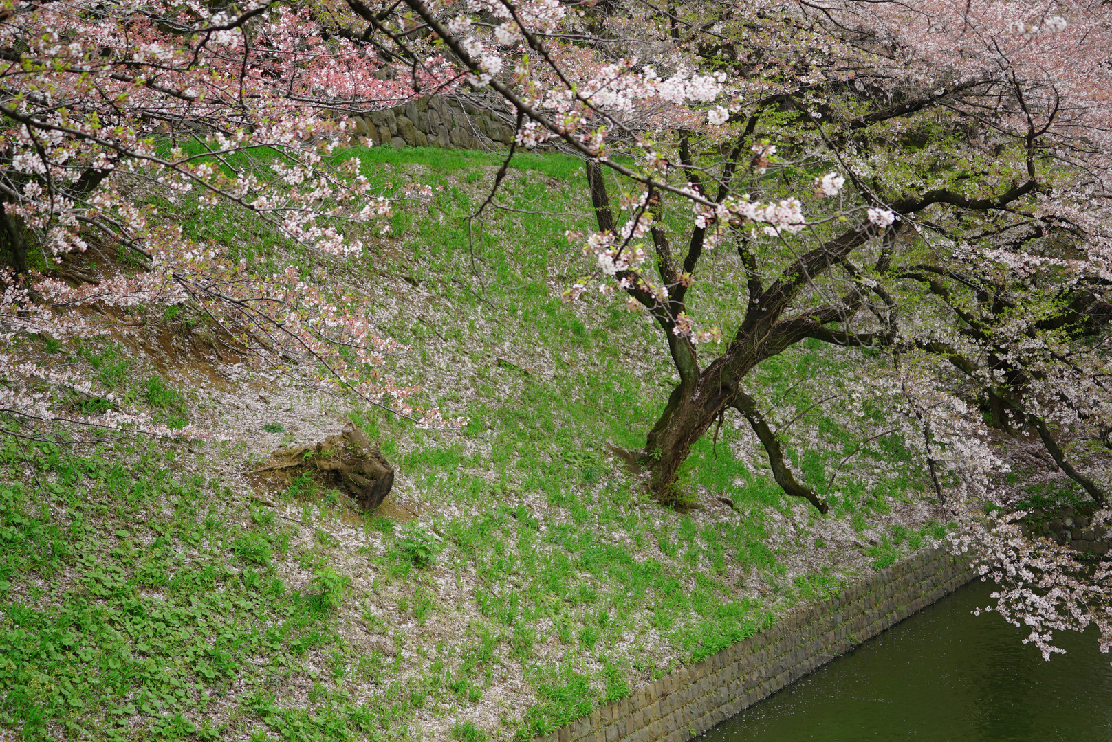 千鳥ヶ淵にて。 散ったサクラの花びらが、緑に積もったところが美しいなぁと。こういうとき高画素機だと楽しいのでしょうか?w