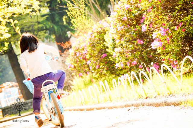 まわりの友達は、みんな乗れるようになりました。 調子よく進んでいたのに、ママが支えてくれなくなると、ぜんぜん乗れなくなります。 「撮ってないで、後ろささえてよ~」と言いたげな、娘。