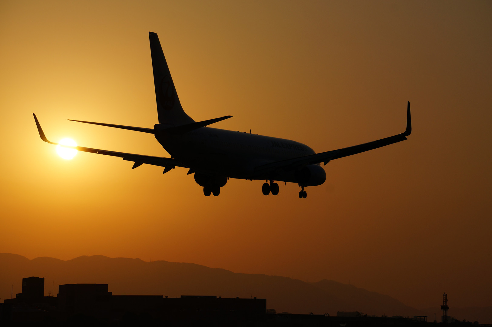 黄昏の中、飛行機が着陸して来ました。