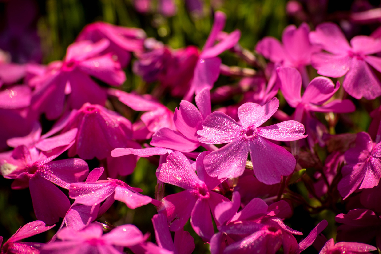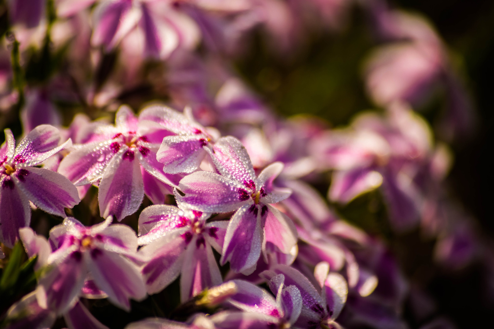 朝露がびっしりと着いた花に太陽の光が注がれてキラキラと反射し、個でも集合でも美しい花たちでした。