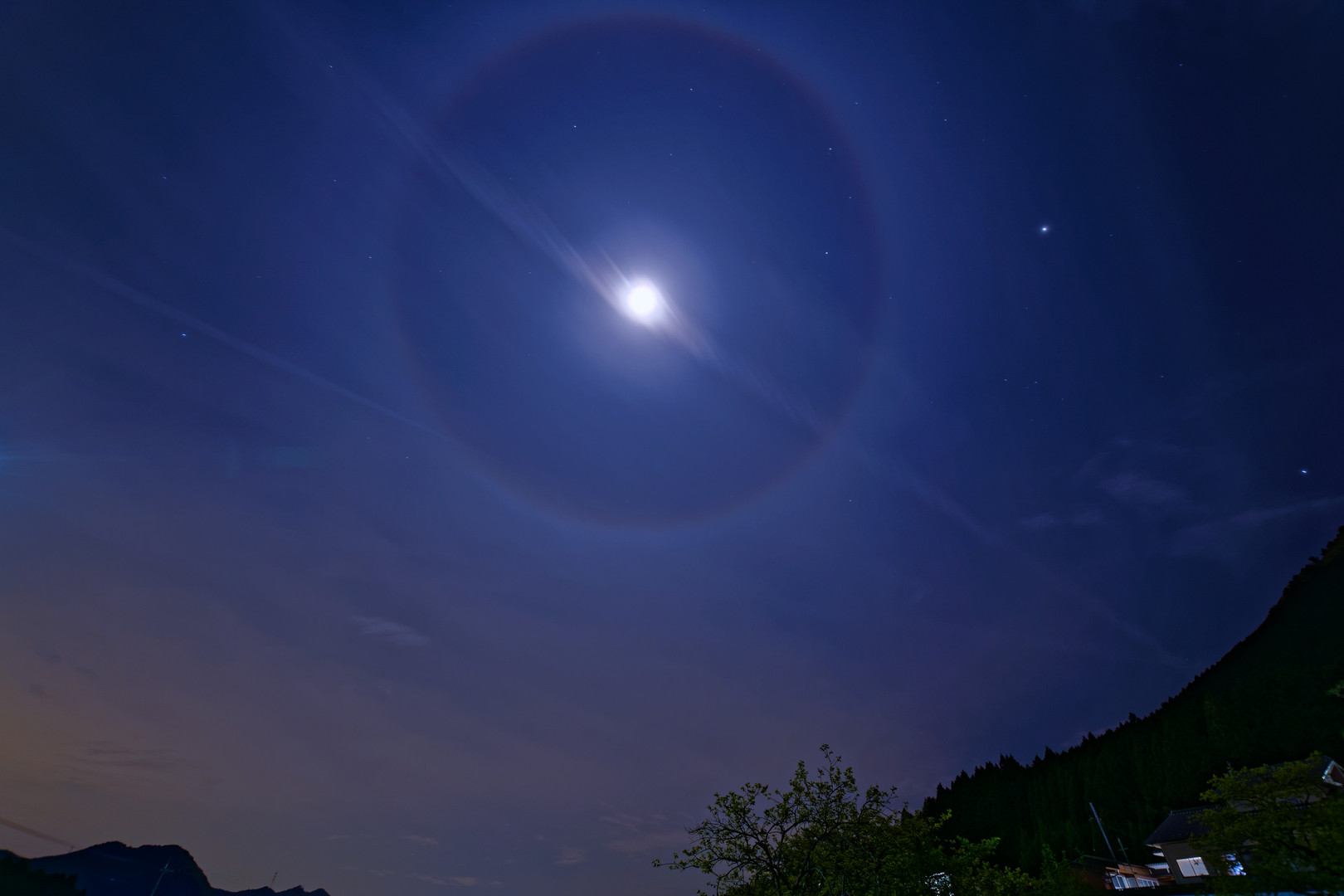 月暈 (つきがさ) が出ていたので撮影してみました。 たいして珍しくもない現象のようですが、こんなにくっきり見えたのは初めてかも。