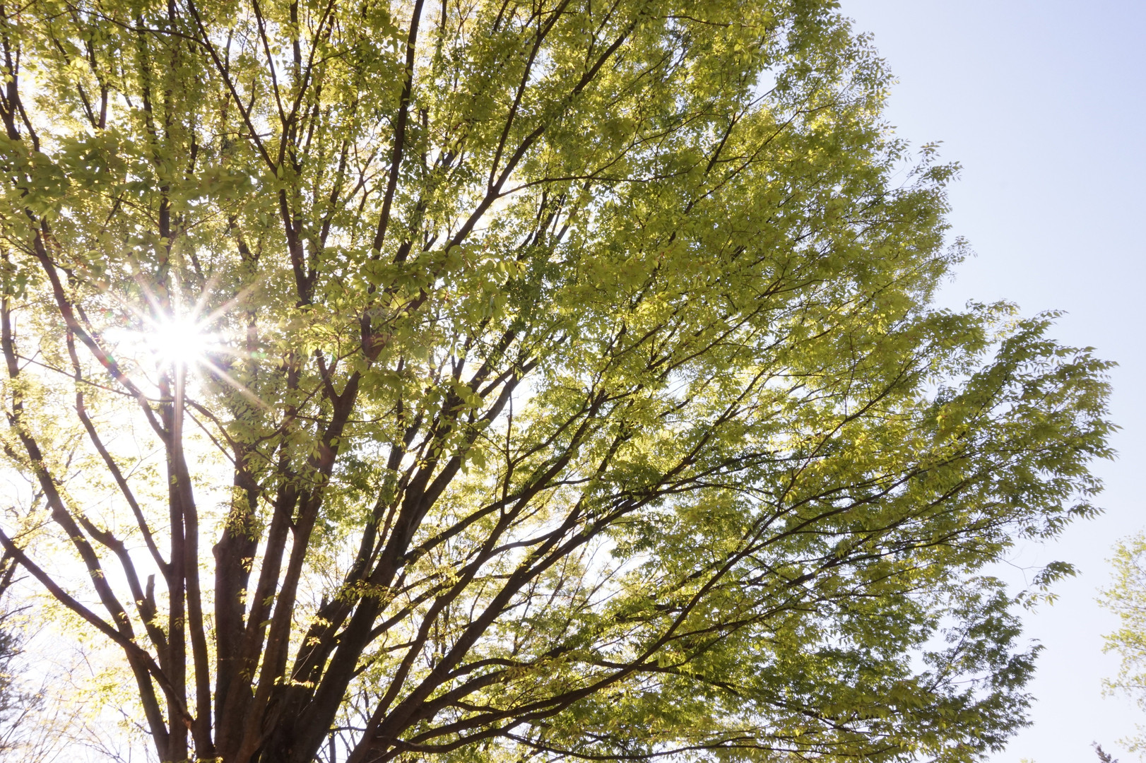 公園のケヤキ。冬は枝だけだったのですが、葉をつけ、大きく空に広がっていました。