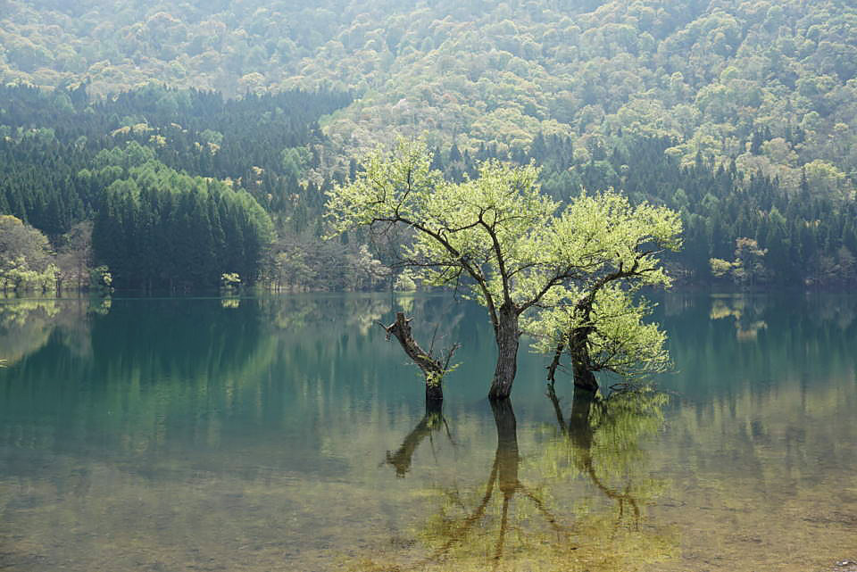 北竜湖と水面に映る新緑です。 湖と菜の花を期待して訪れましたが、少し標高が高いために花は咲いていませんでした。でも山間のエメラルドグリーンの湖はきれいでした。
