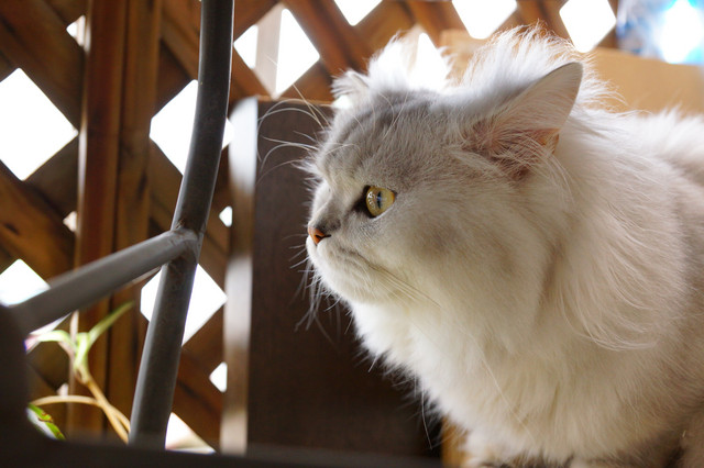 ベランダでの一時、天気の良い日は陽射しを避けてテーブルの下で寛いでいます