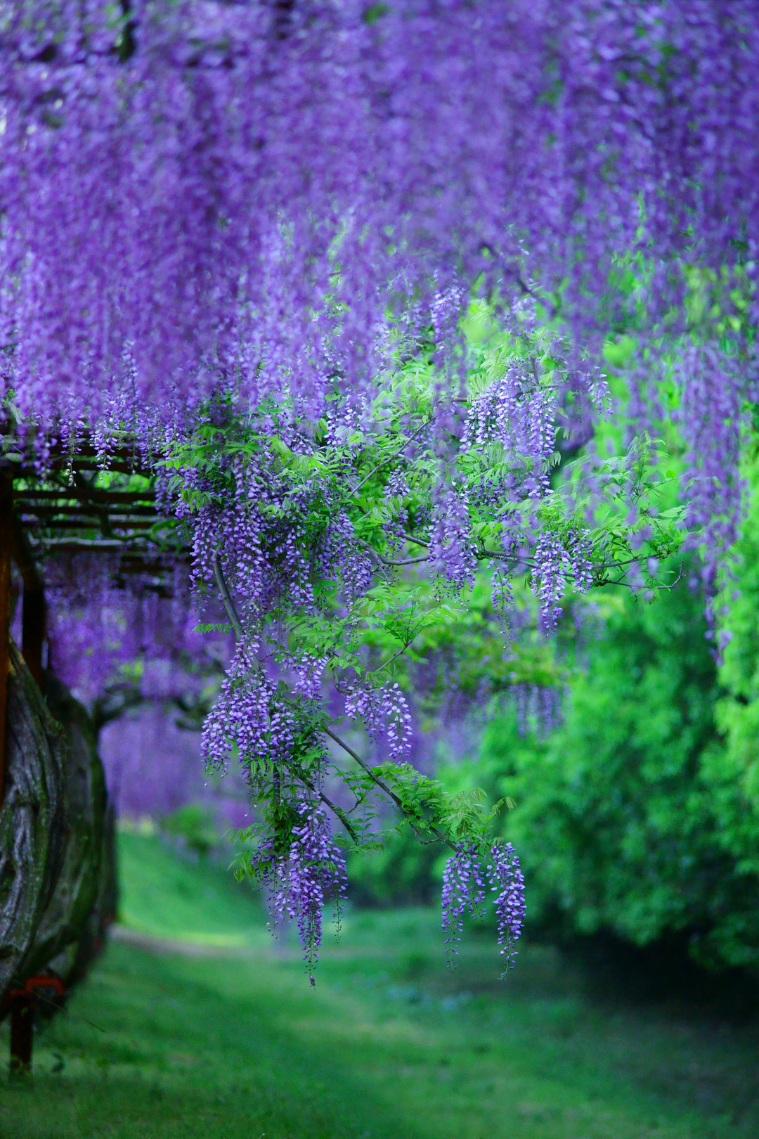 岡山県和気町藤公園です。今まさに満開で、約100種類、紫、ピンク、白の藤が咲き乱れていました。この日は藤まつりの最中でしたが、開園前まだ数人のカメラマンがいただけで、早朝の公園には、シャッターの乾いた音だけが響いていました…