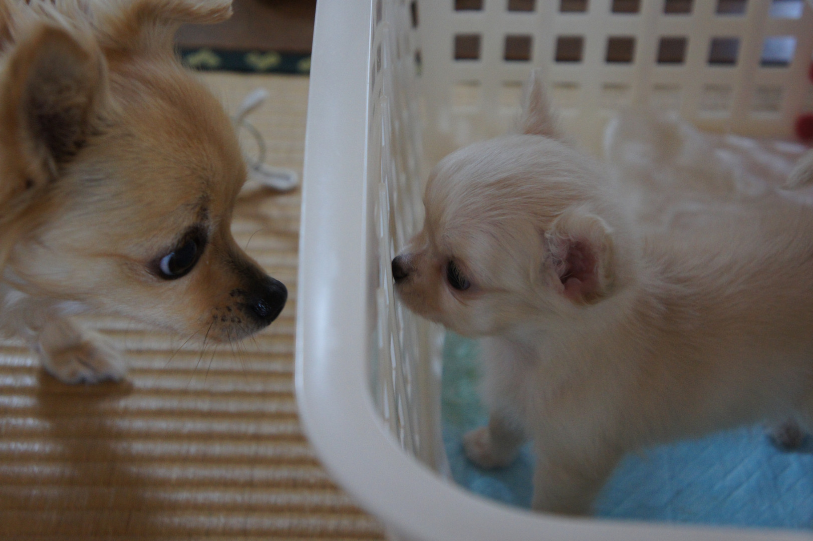 我が家に、あたらしい、ワンコが来ました。 クリームのチワワの赤ちゃんです♡ レッドのチワワ(5歳)と初めての御対面です。 うまくやってくれるかな?