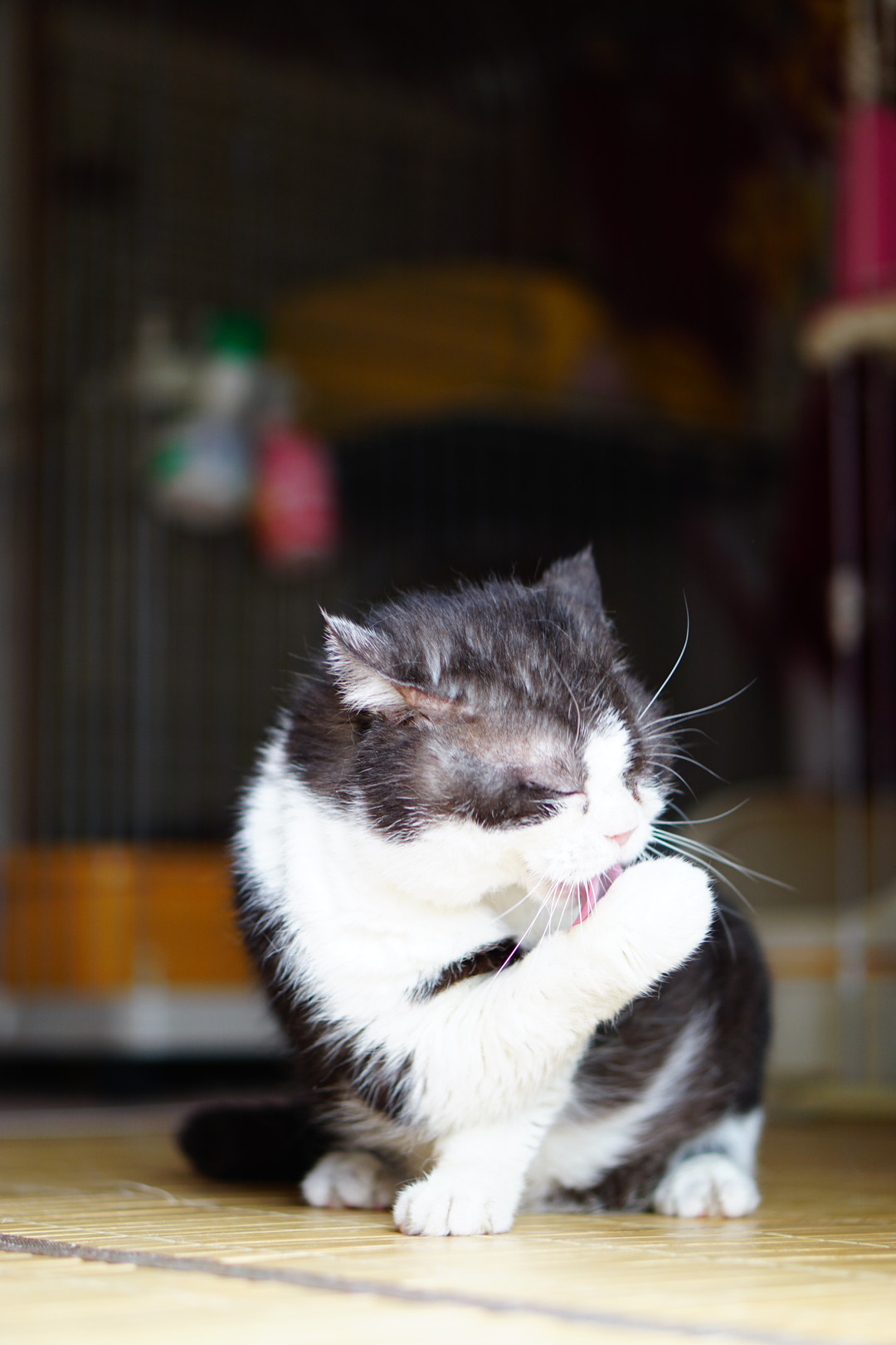 ねこが沢山いるのに新入りがきました。朝ごはんを食べごちそうさまで顔をなめています。おとなしく面白い顔ですが、すりすりが大好きで可愛いです。年齢も8才くらいかな?ねこ大好き(=^・^=)です。