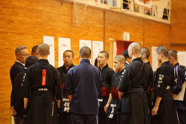 福島県高体連剣道いわき大会。試合前に監督からのアドナイスを真剣な眼差しで聞く部員達