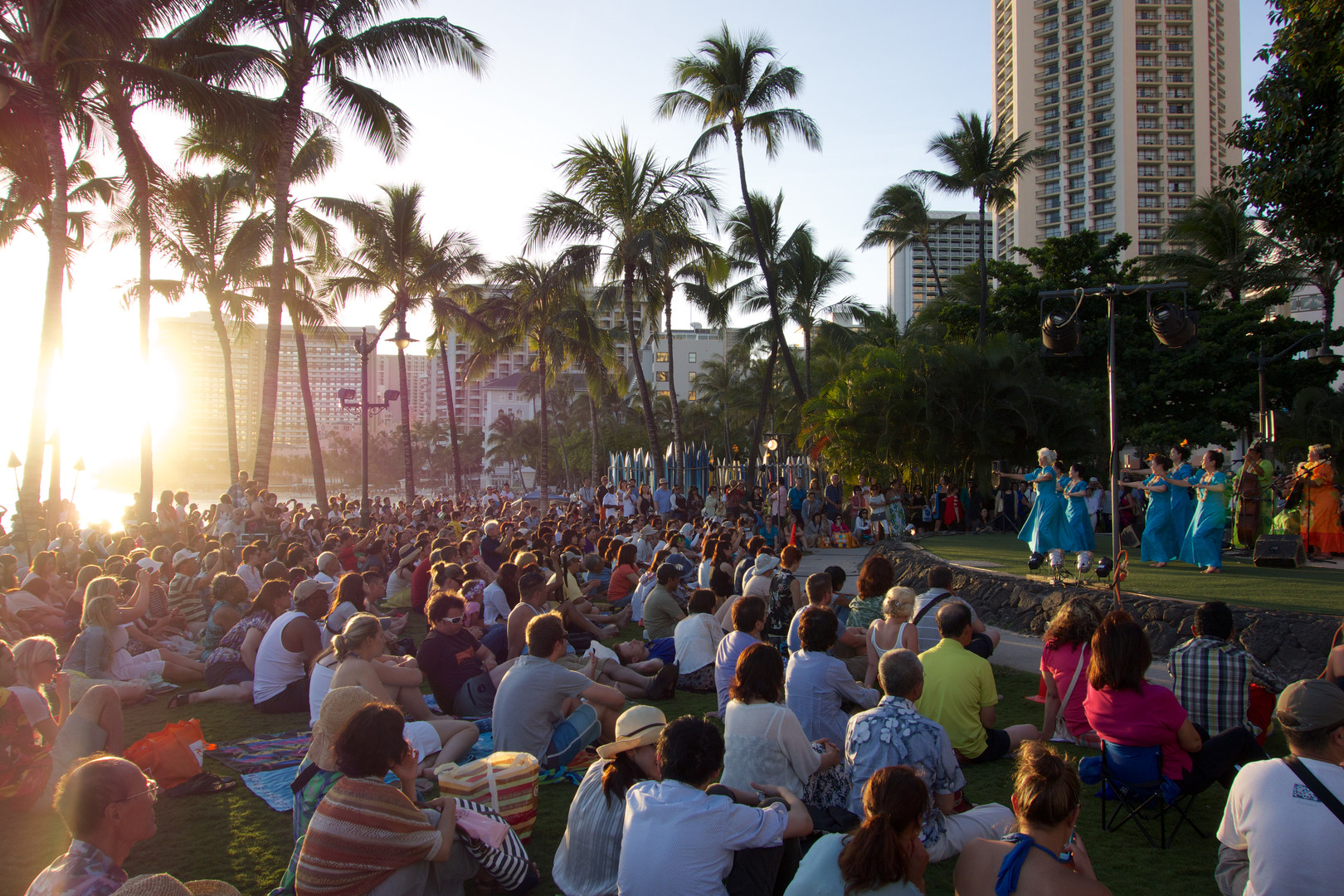 ワイキキで行われたフラのサンセットステージ。波の音とウクレレと美しいフラ。