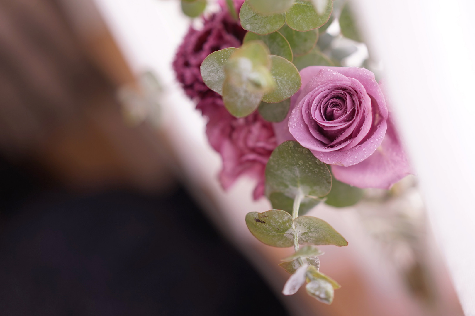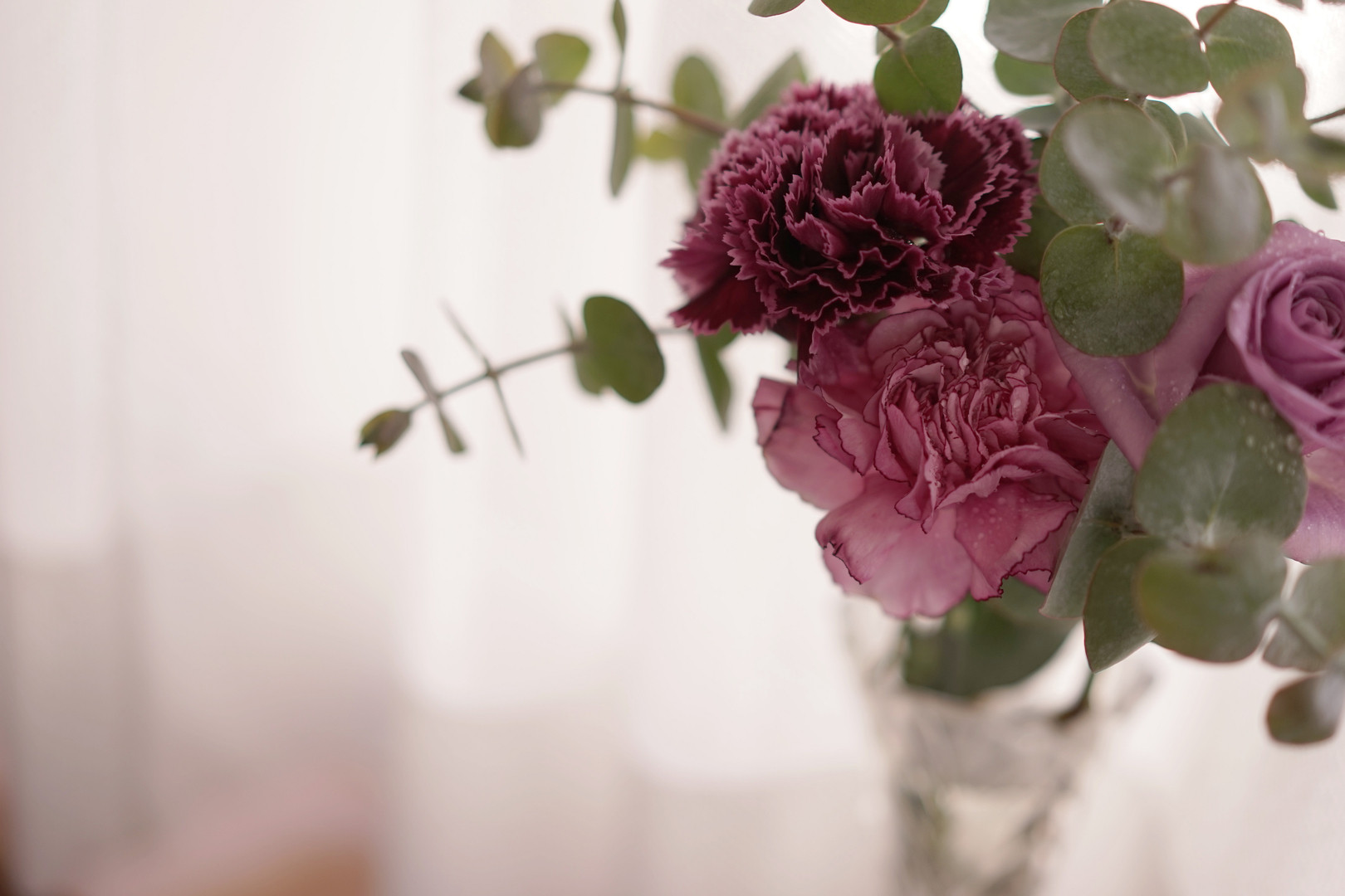 好きな色の薔薇とカーネーション、窓辺に置いて撮影