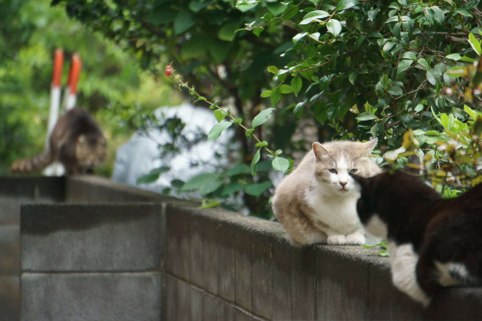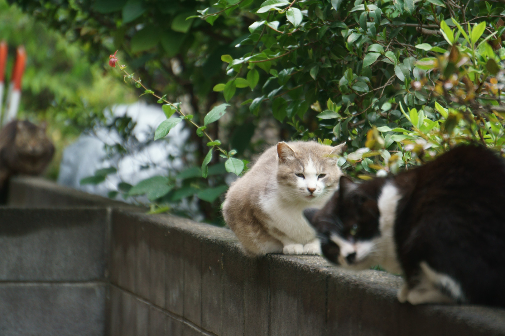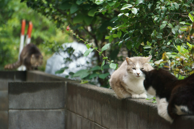 にらみ合っている猫2匹 と思ったら援軍?登場