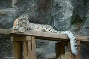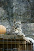 多摩動物公園にて、ユキヒョウさんです。 カメラ目線とナイスポーズいただきました。 その微笑みに射抜かれる感じ。 しっかし、手ぇでっか!しっぽ太っ! 超きれい。カワイイ。本当は怖い猛獣だけど。