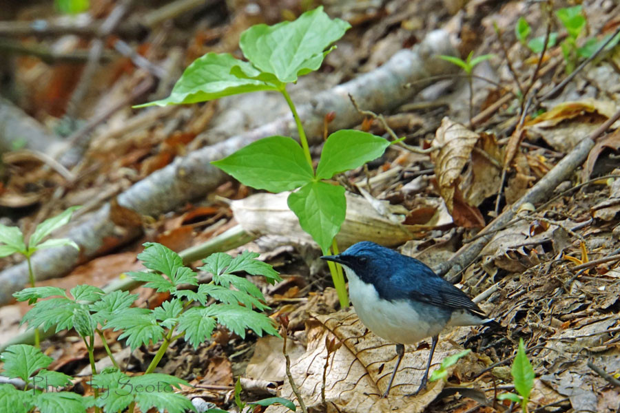 綺麗な瑠璃色のコルリ 餌を探して地面をお散歩