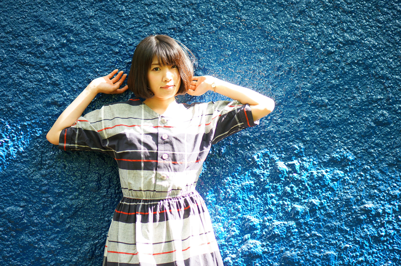 青い壁が印象的でその前でポートレートを。 何か深海を思わせます。