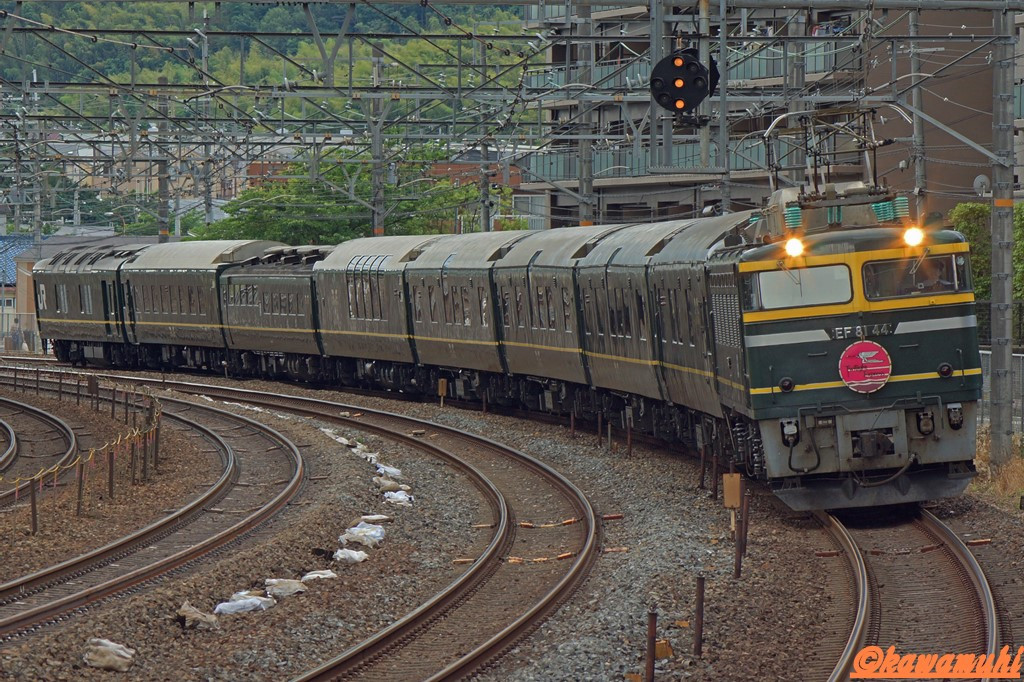 復活したトワイライトエキスプレスです。鉄道写真の定番撮影ポイント、大山崎カーブ、通称「サントリーカーブ」で撮影です。40~50名程度の人数が撮影に来ており、いまだ衰えない人気に列車も誇らしげでした。(^^♪
