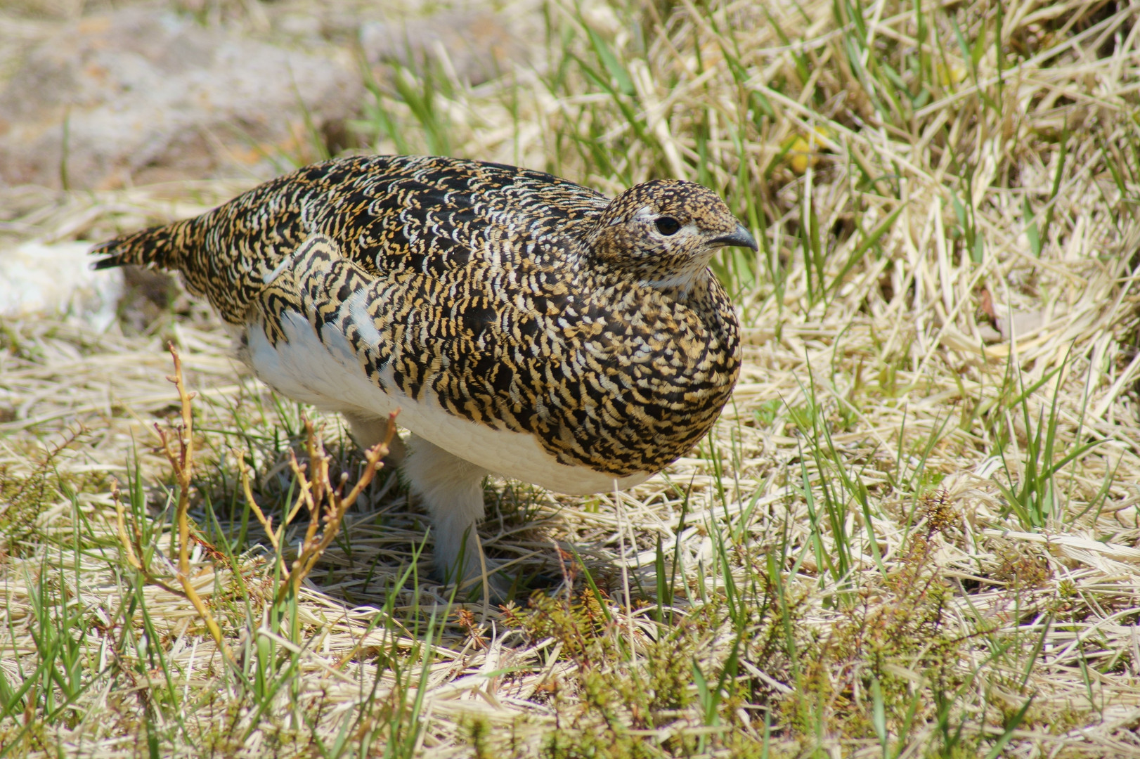 ライチョウ発見。 カメラ構えた人たちが注目するなか、気にせず普通にトコトコ歩いている……。