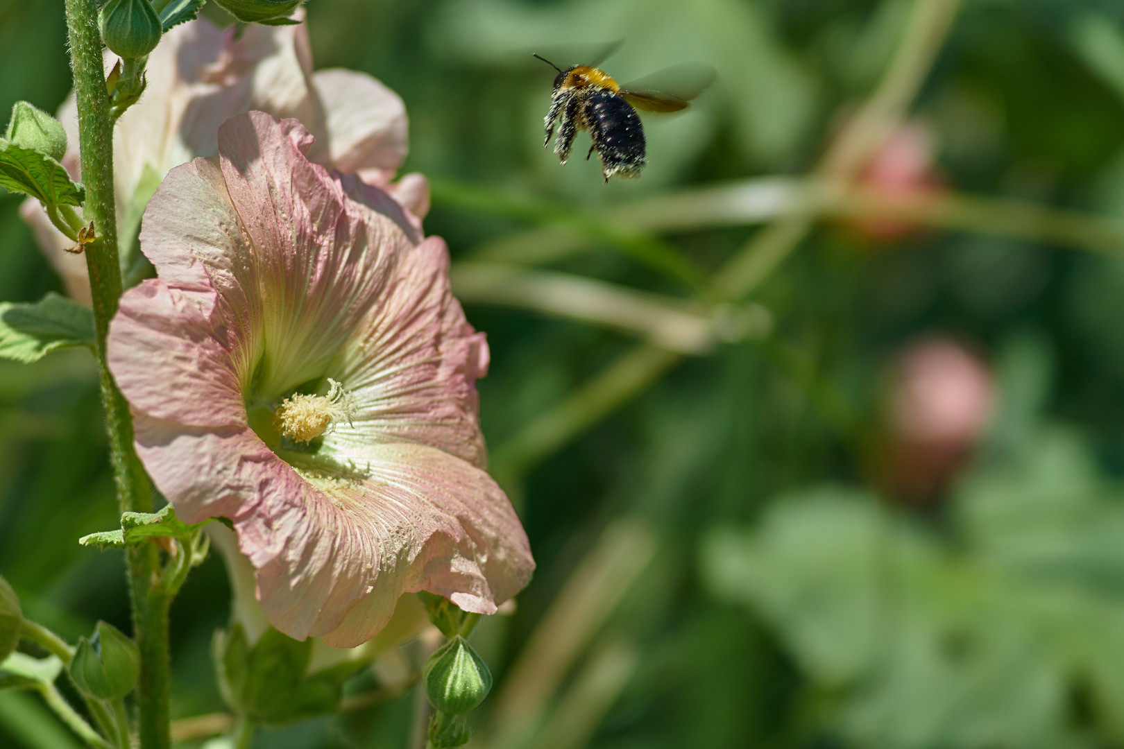 いささか、飛び方が覚束ないクマバチ。 風に揺れる立葵に見事着地を決めるのか..? そしてSSが足りてないのは大丈夫なのか!?