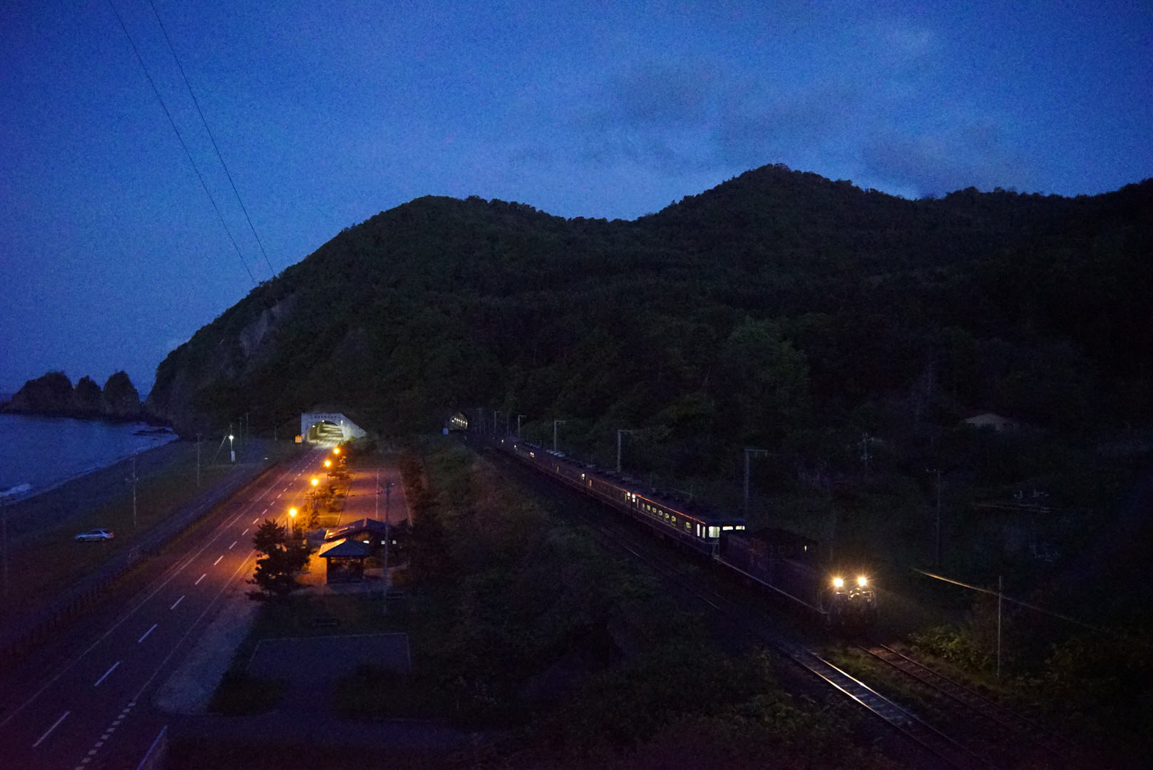 朝の3時になると急に空が明るくなりだす。 夜通し走ってきた急行列車が行く。