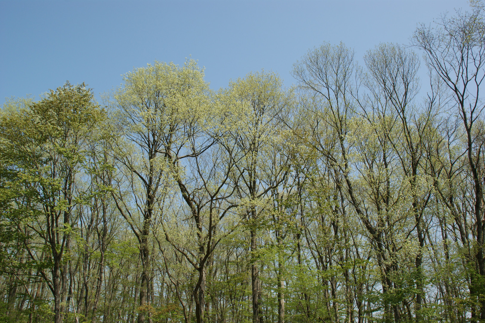 仙台郊外の雑木林の新緑、木々の若葉が青空にまぶしい輝きでした。