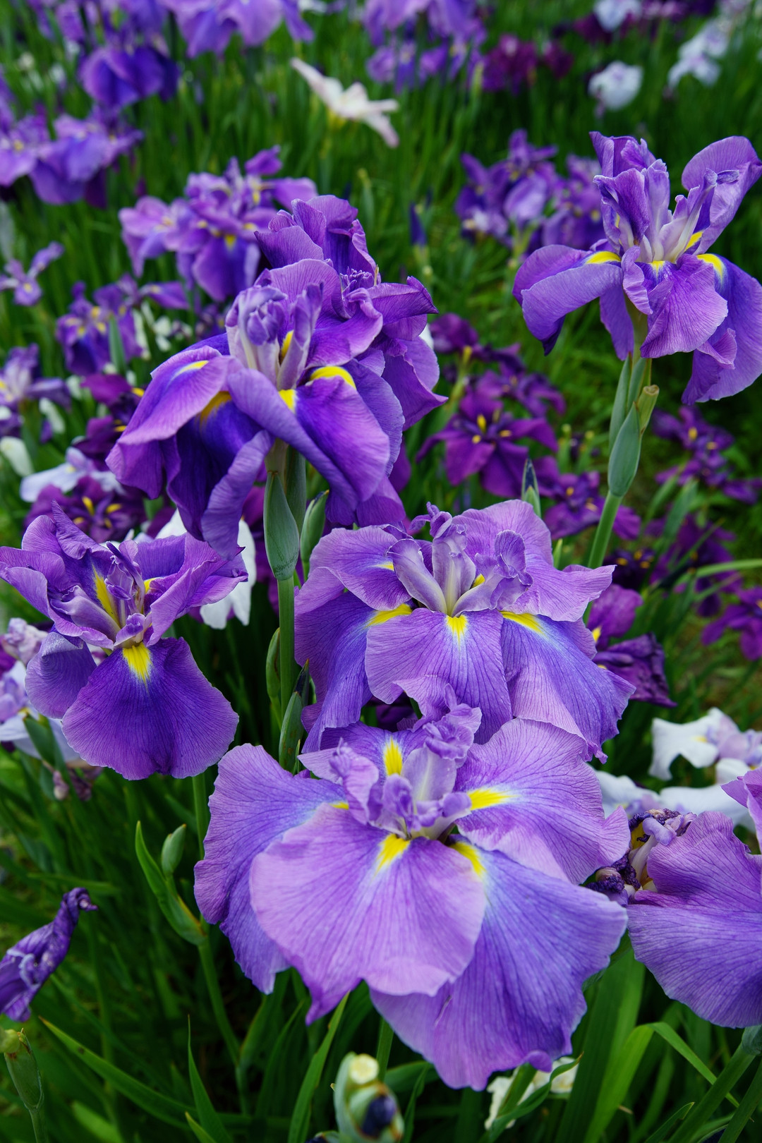 咲き頃を迎えた花菖蒲園での一枚です。白、ピンク、青、紫ときれいに咲いていました、この紫が花びらを伸ばして、一番勝ち誇っていました、