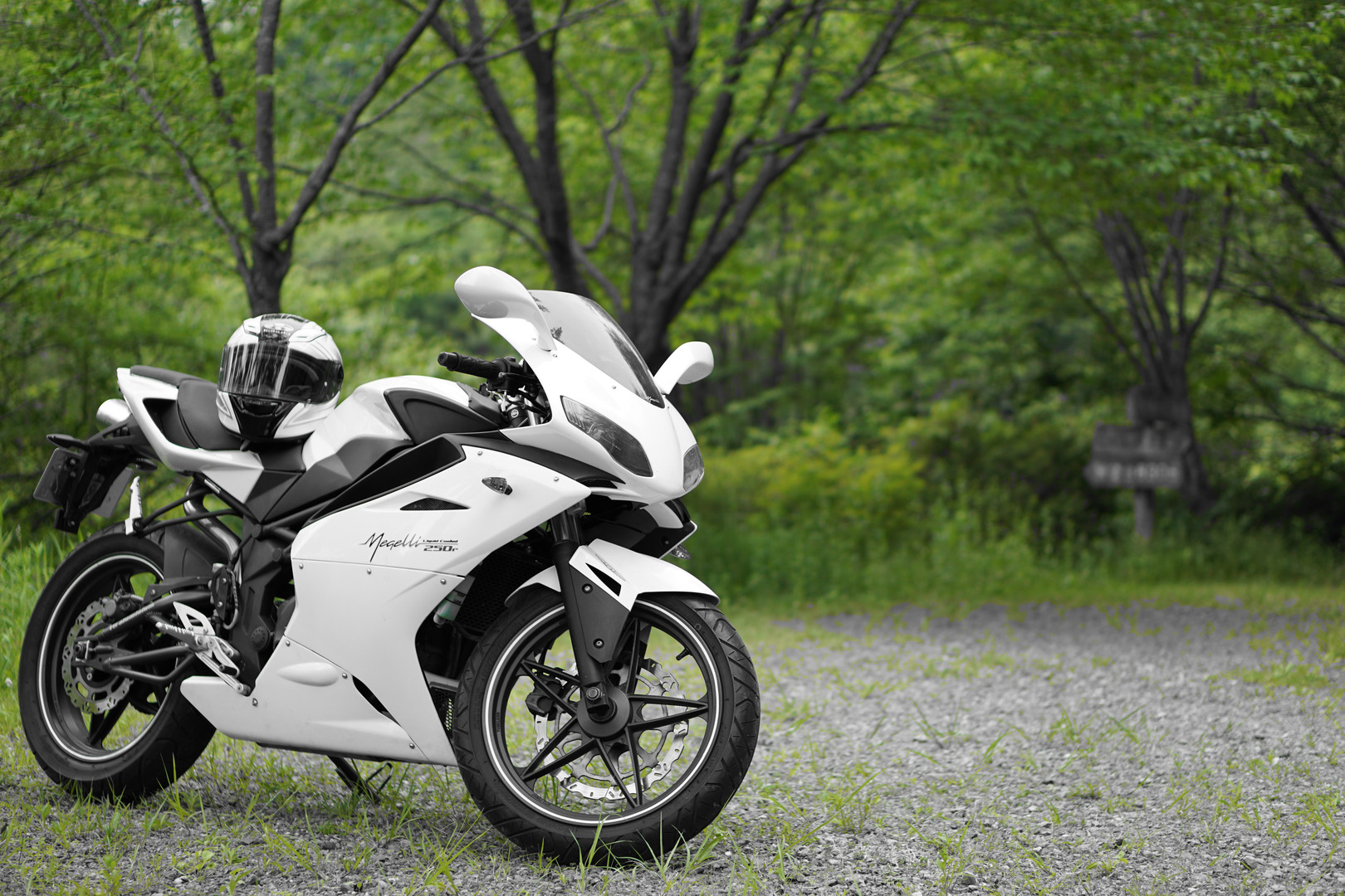 Megelli250rというバイクを 森の小道で撮影してみました。