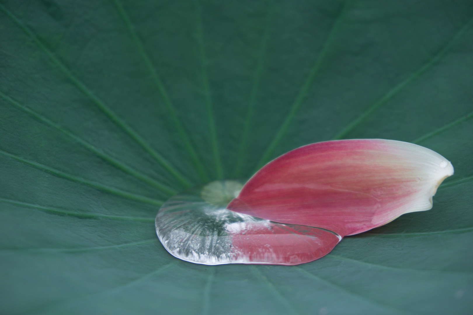 雨上がりの昭和記念公園、蓮の葉に水が溜り、花弁が浮かんでいた