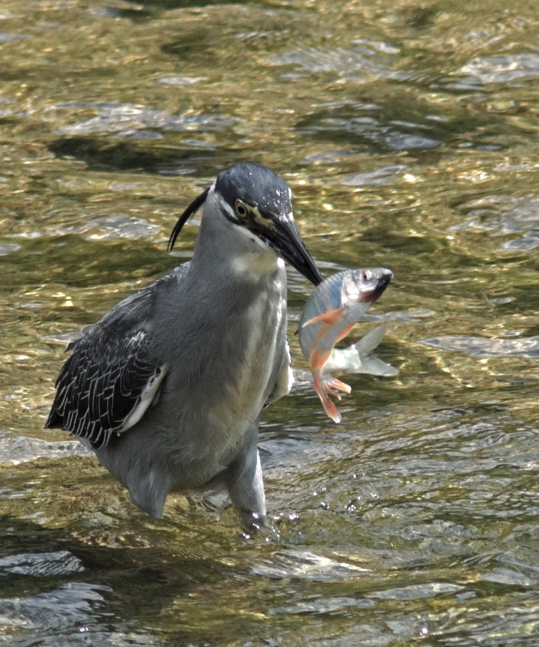 ササゴイが流れに突入して見事に獲物(オイカワ)を嘴で串刺しにして獲りこんだ情景描写です。
