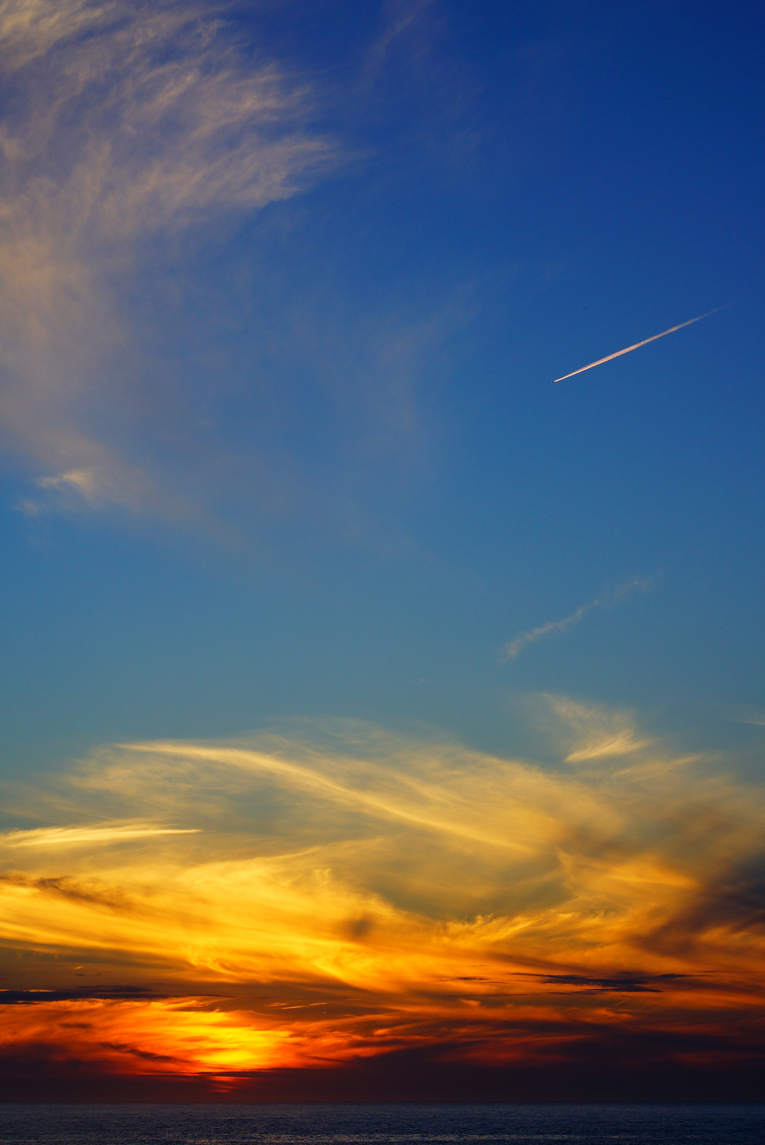雲が渦を巻いたかのような夕焼けに飛行機が向かっていく 飛行機からの眺めは「どんな風に見えているのでしょうか?」