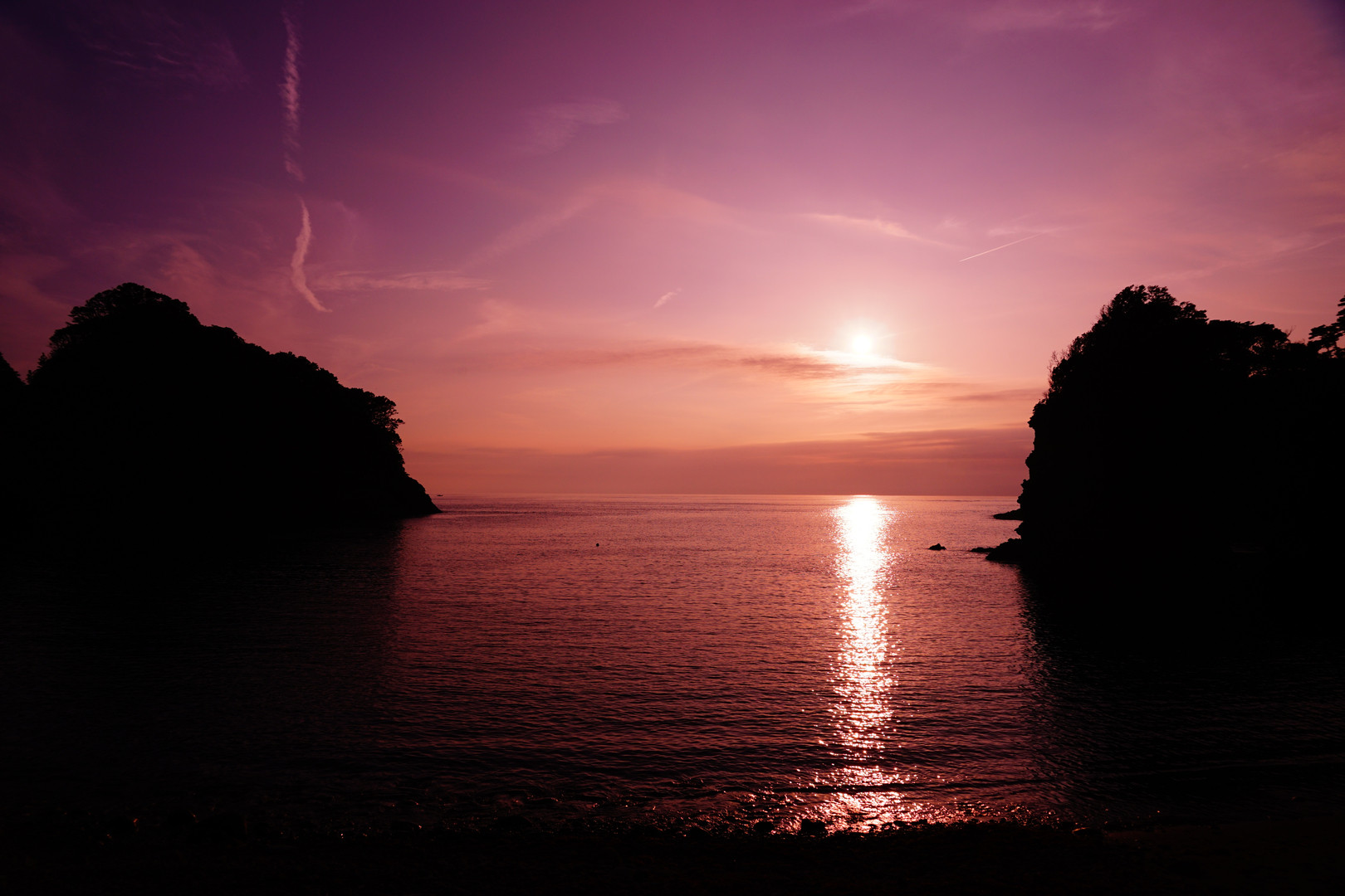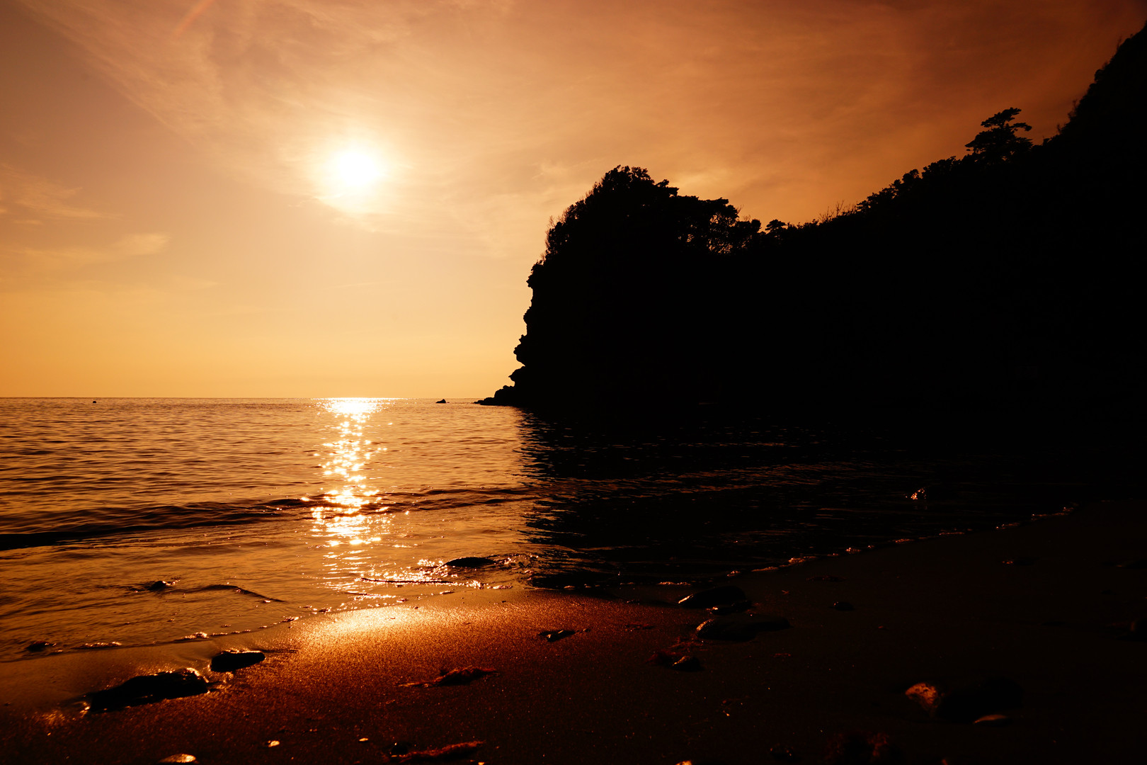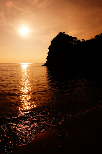 無名の岩に沈んでいく夕日。