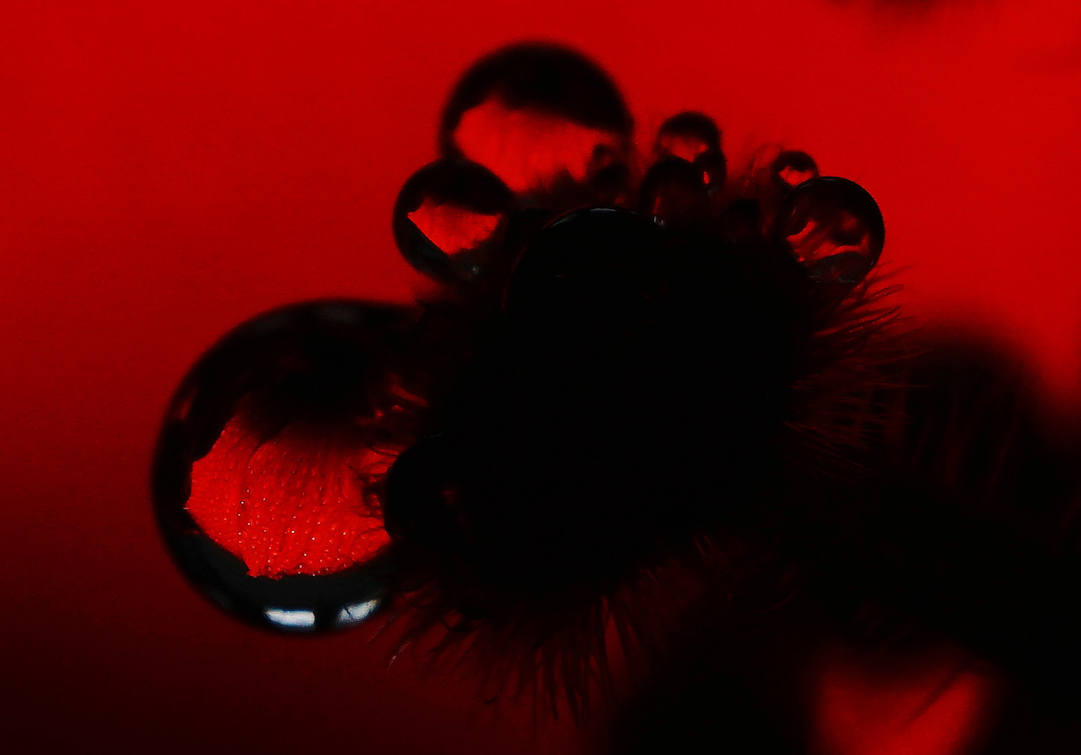 ハイビスカスの雌しべの先に溜まった水滴の中の花弁が妖艶でした。