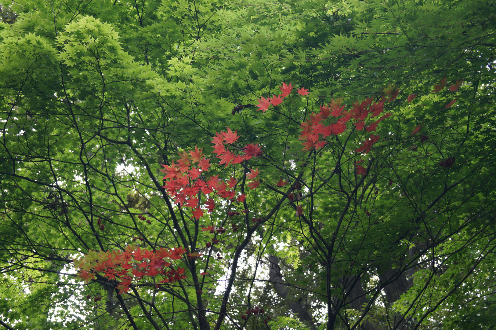 緑に囲まれて一本だけ色づいています。