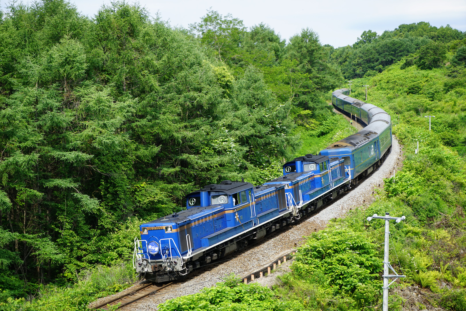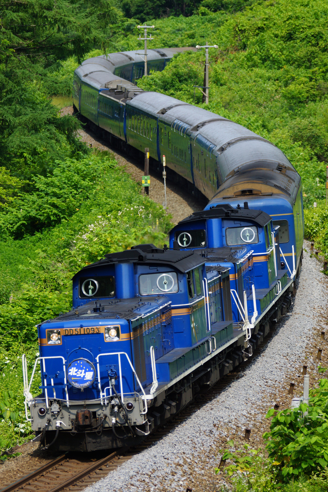 ようちゃんさんとの撮影旅行二日目。 初夏の北海道、7月7日に有名な宇宙軒カーブを駆け抜ける北斗星。 DD51重連が牽引し、大蛇の様に目の前を駆け抜けて行きます。 ようちゃんさん、宇宙軒+北斗星を撮影したかったようで、 念願かなって物凄くはしゃいでました(^^)